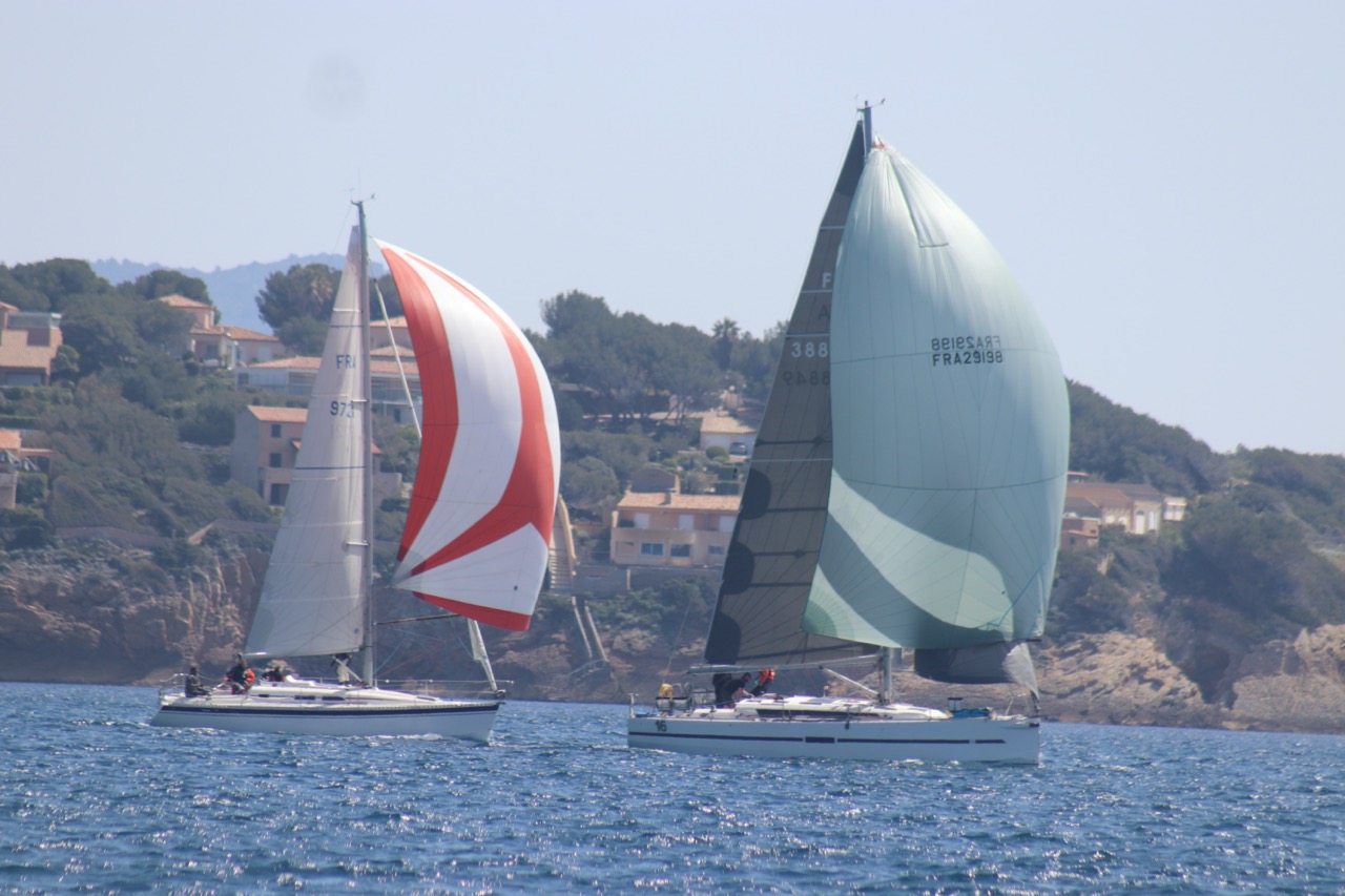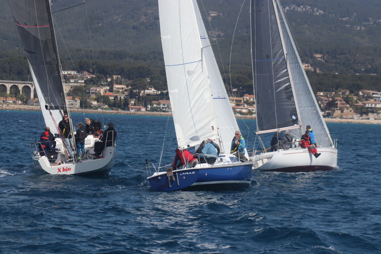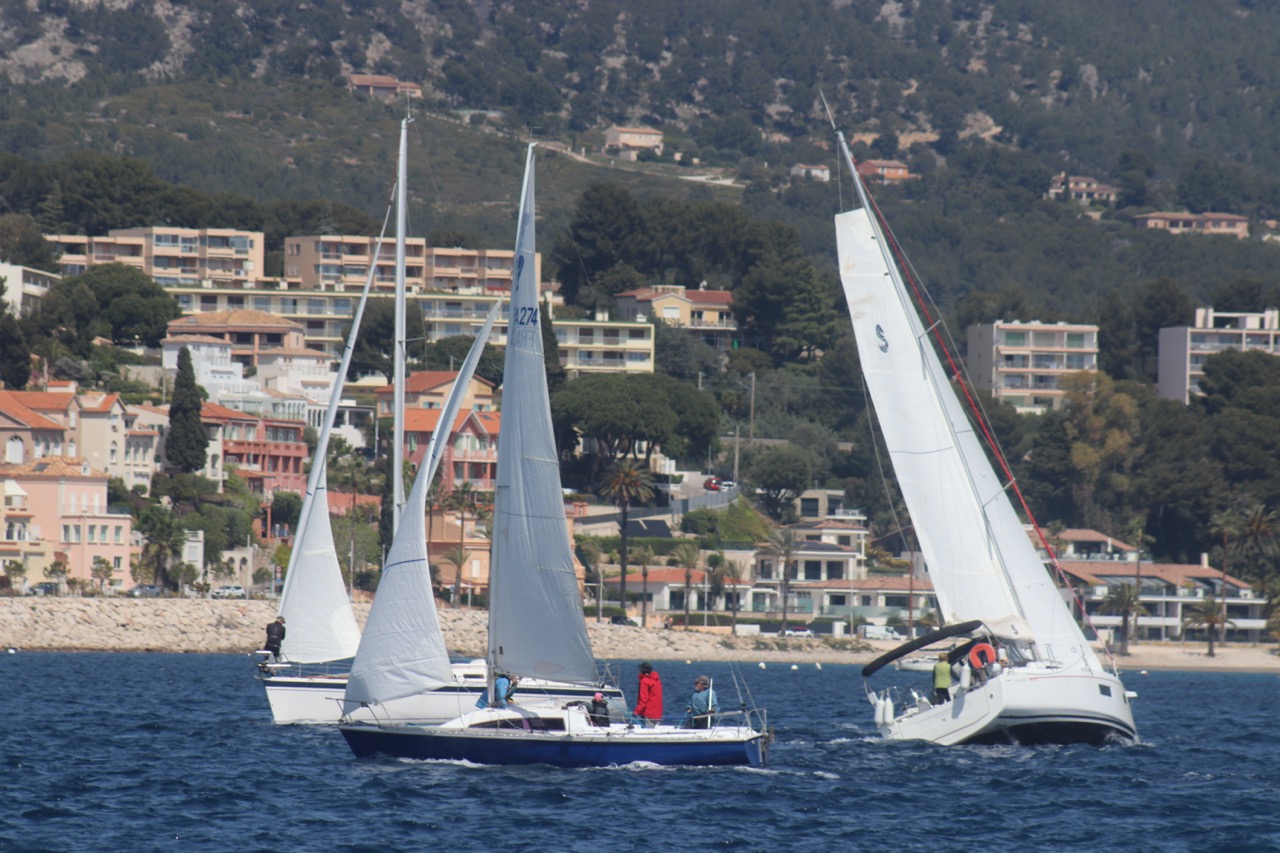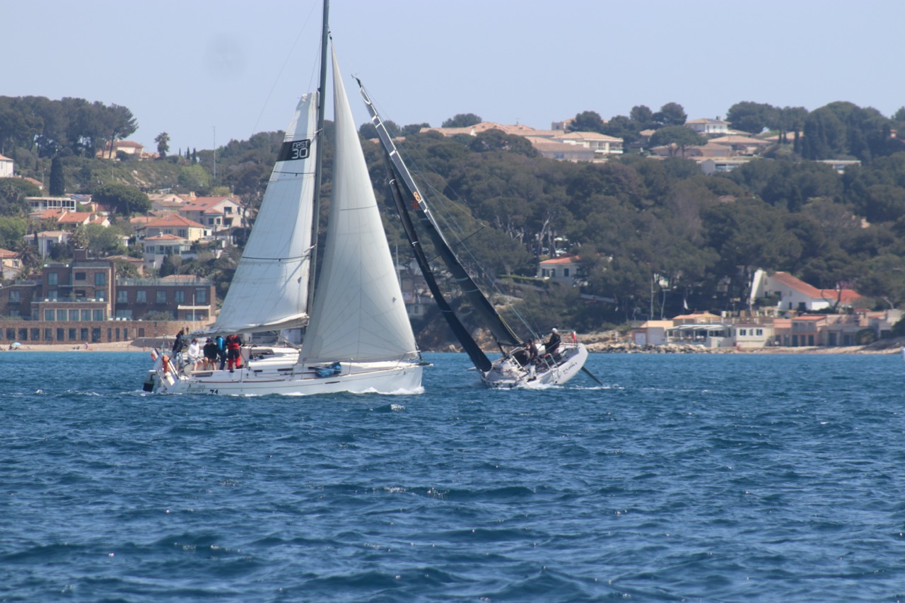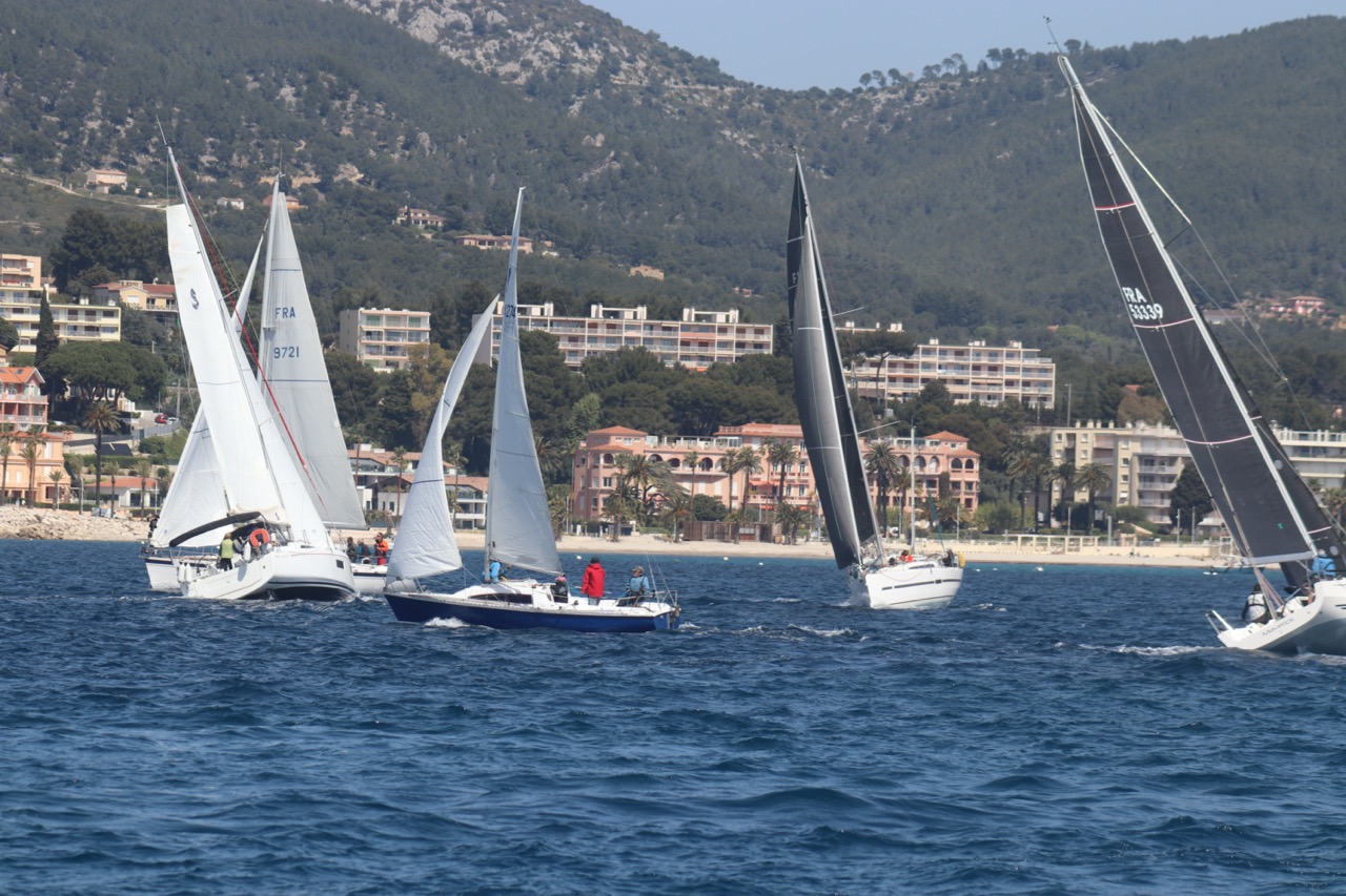 La régate s’est déroulée dans des conditions idéales : 12/17 noeuds de vent d’est. Après un rappel général, le départ de la régate a pu avoir lieu. Le parcours 2 était mouillé : bouée dans le sud-ouest de l’île Rousse, bouée de Sanary, bouée de l’île Rousse, bouée de Sanary et retour à Bandol.