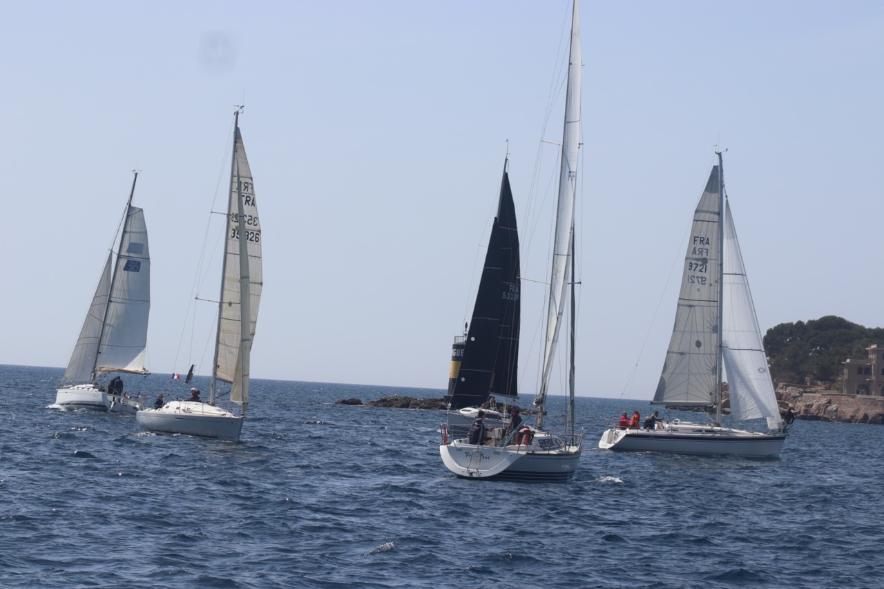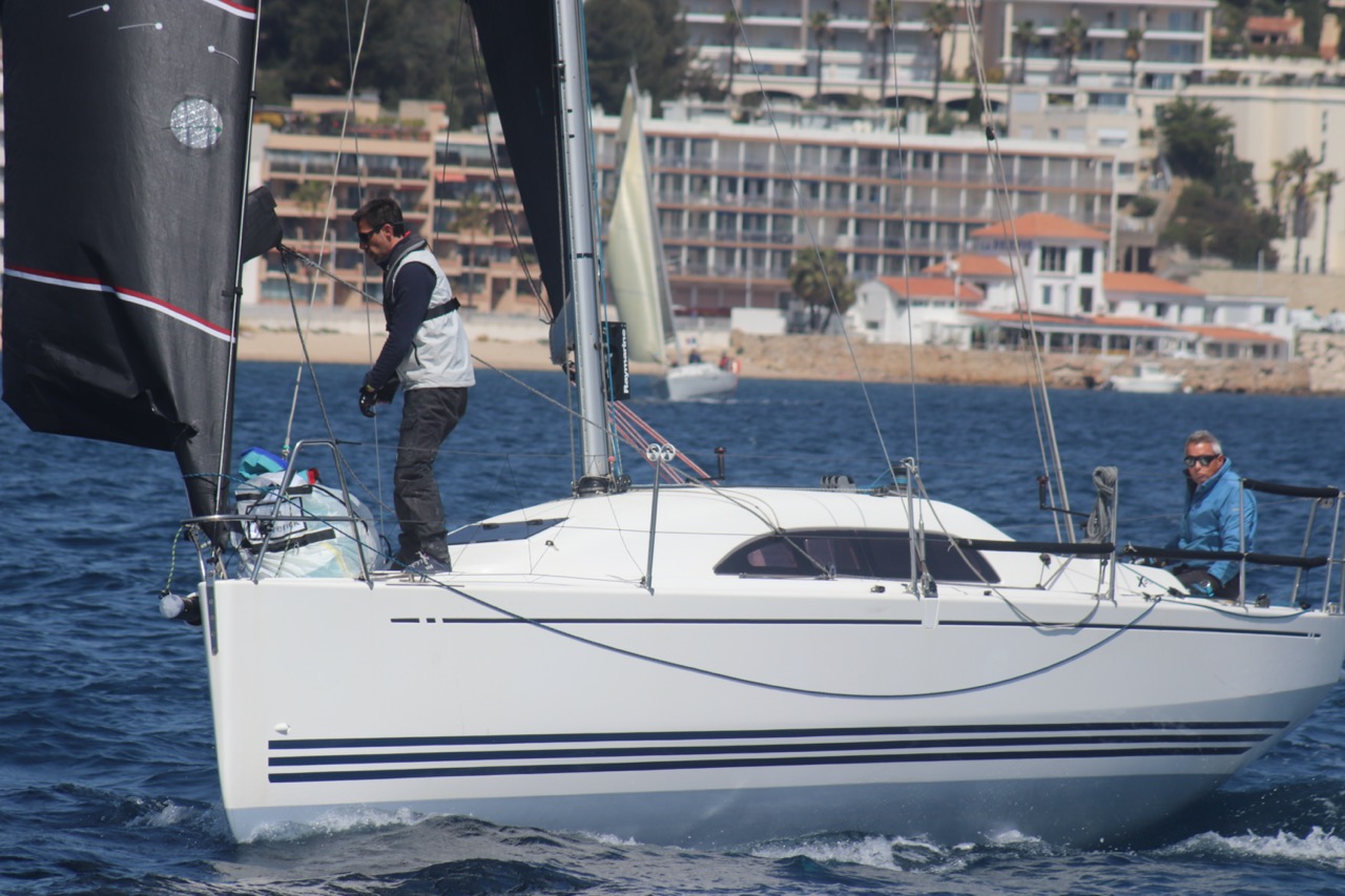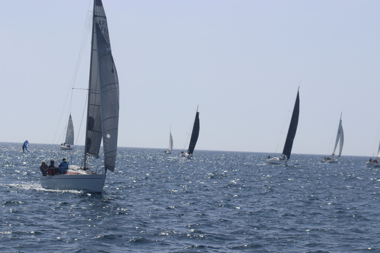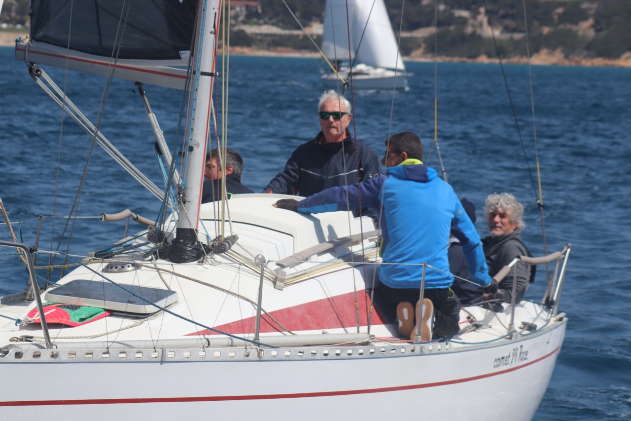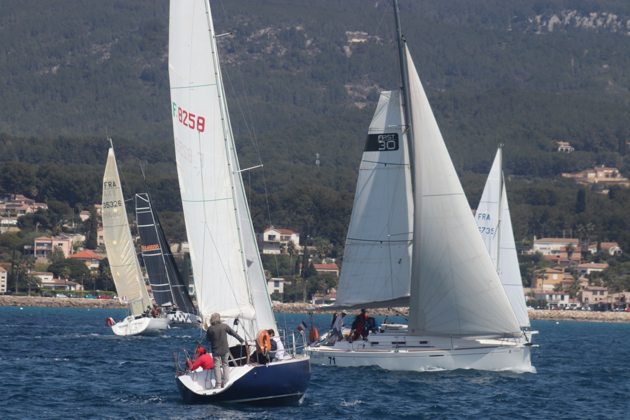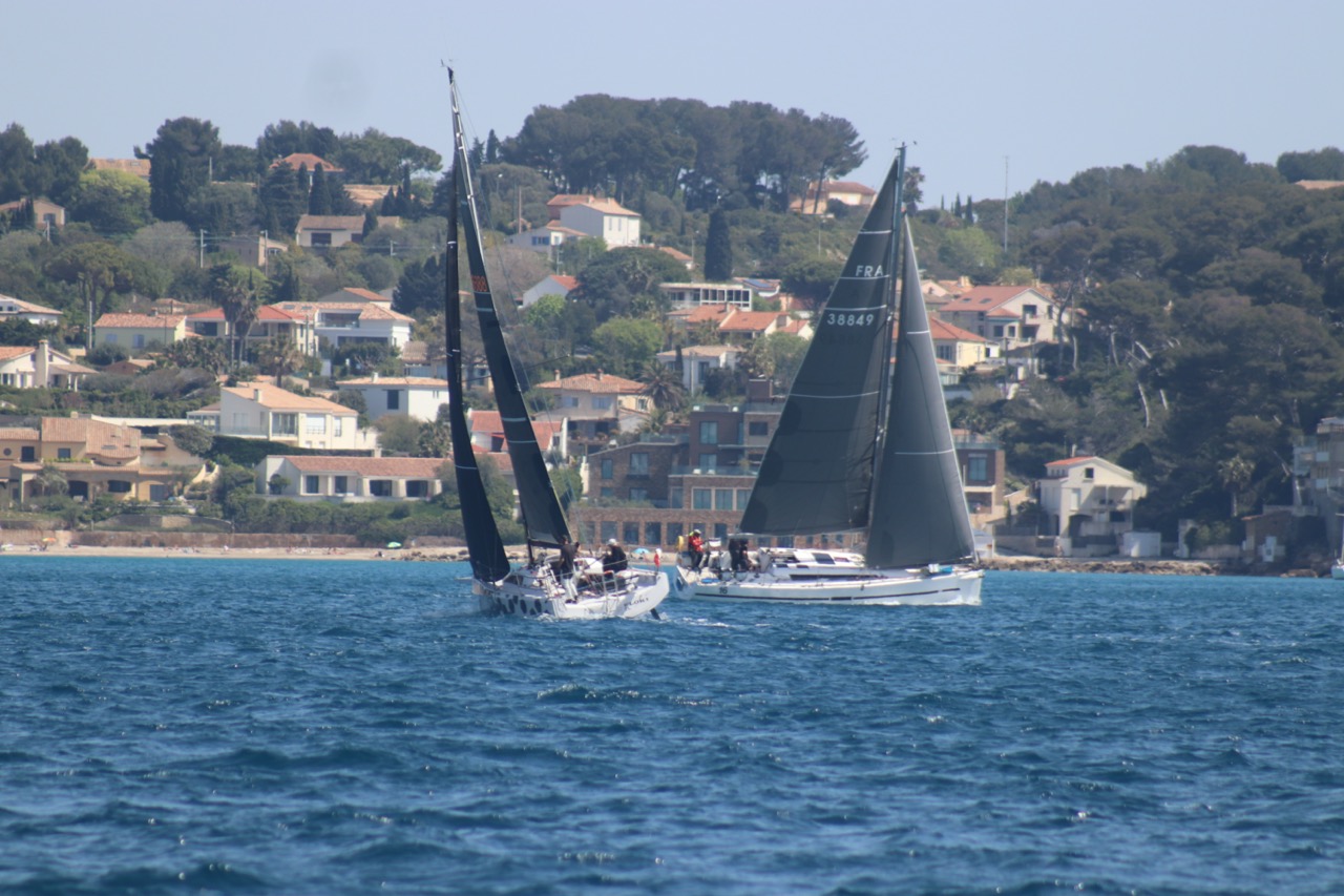 La régate s’est déroulée dans des conditions idéales : 12/17 noeuds de vent d’est. Après un rappel général, le départ de la régate a pu avoir lieu. Le parcours 2 était mouillé : bouée dans le sud-ouest de l’île Rousse, bouée de Sanary, bouée de l’île Rousse, bouée de Sanary et retour à Bandol.