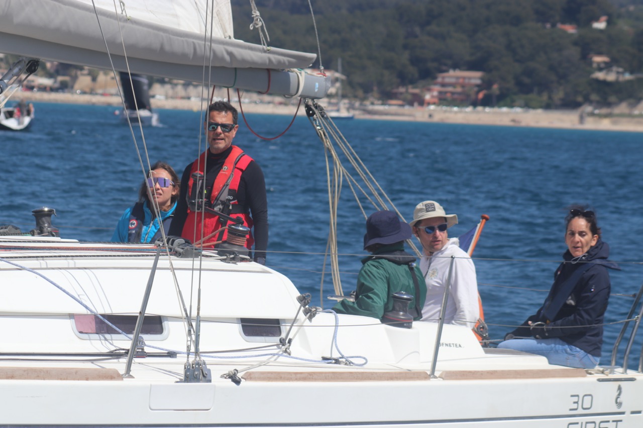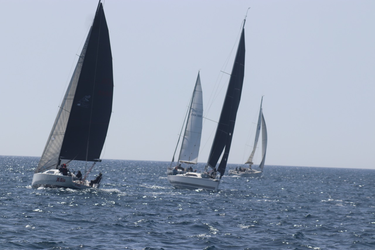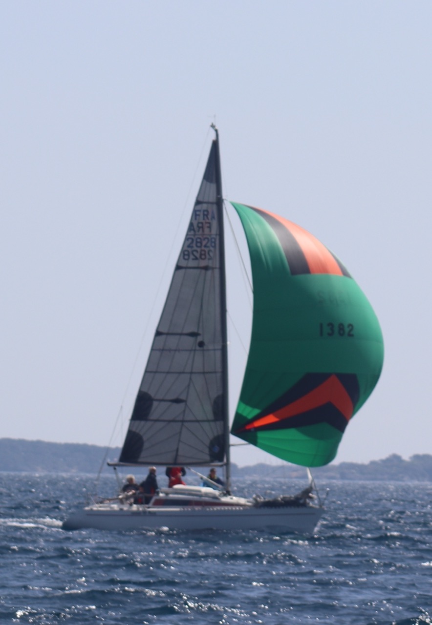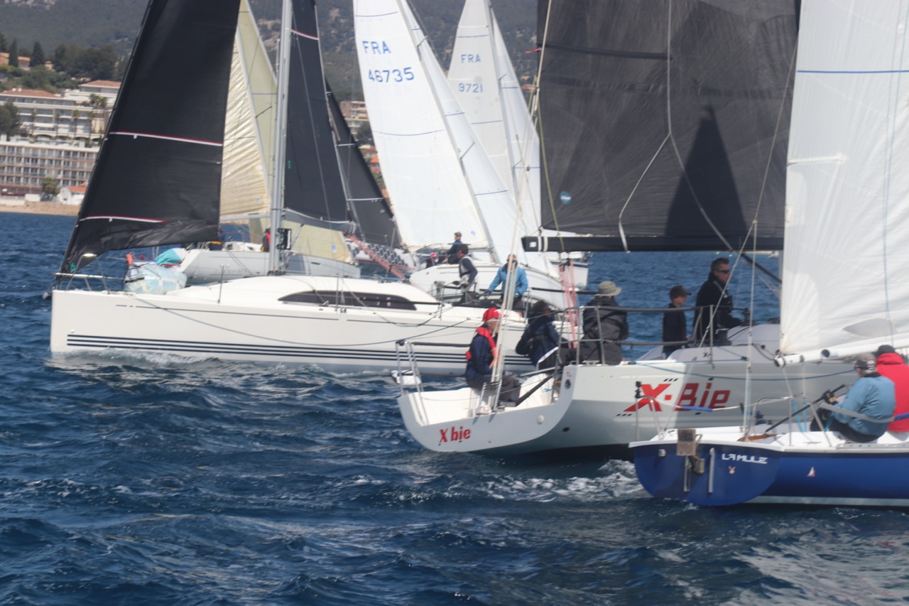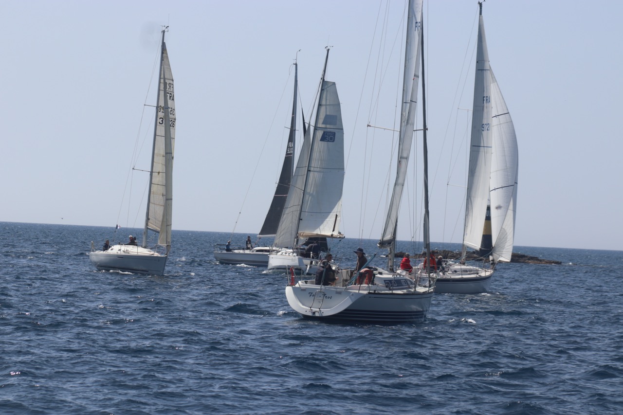 La régate s’est déroulée dans des conditions idéales : 12/17 noeuds de vent d’est. Après un rappel général, le départ de la régate a pu avoir lieu. Le parcours 2 était mouillé : bouée dans le sud-ouest de l’île Rousse, bouée de Sanary, bouée de l’île Rousse, bouée de Sanary et retour à Bandol.