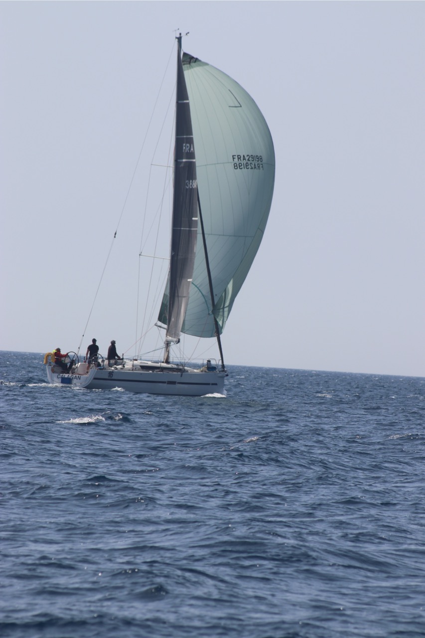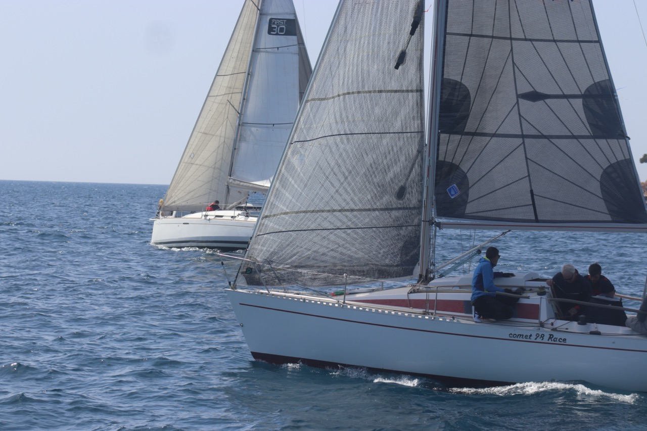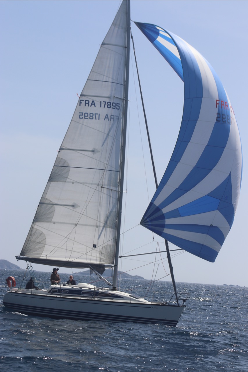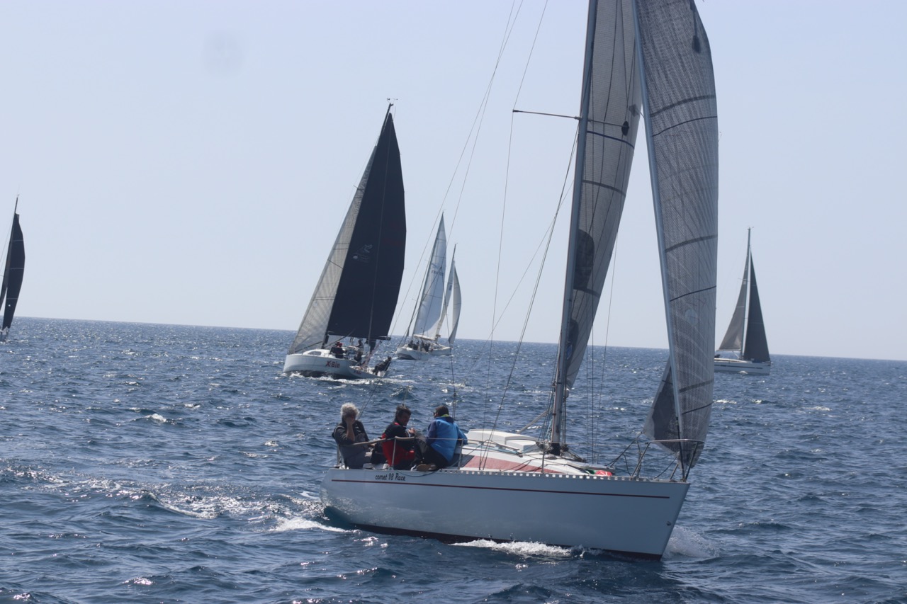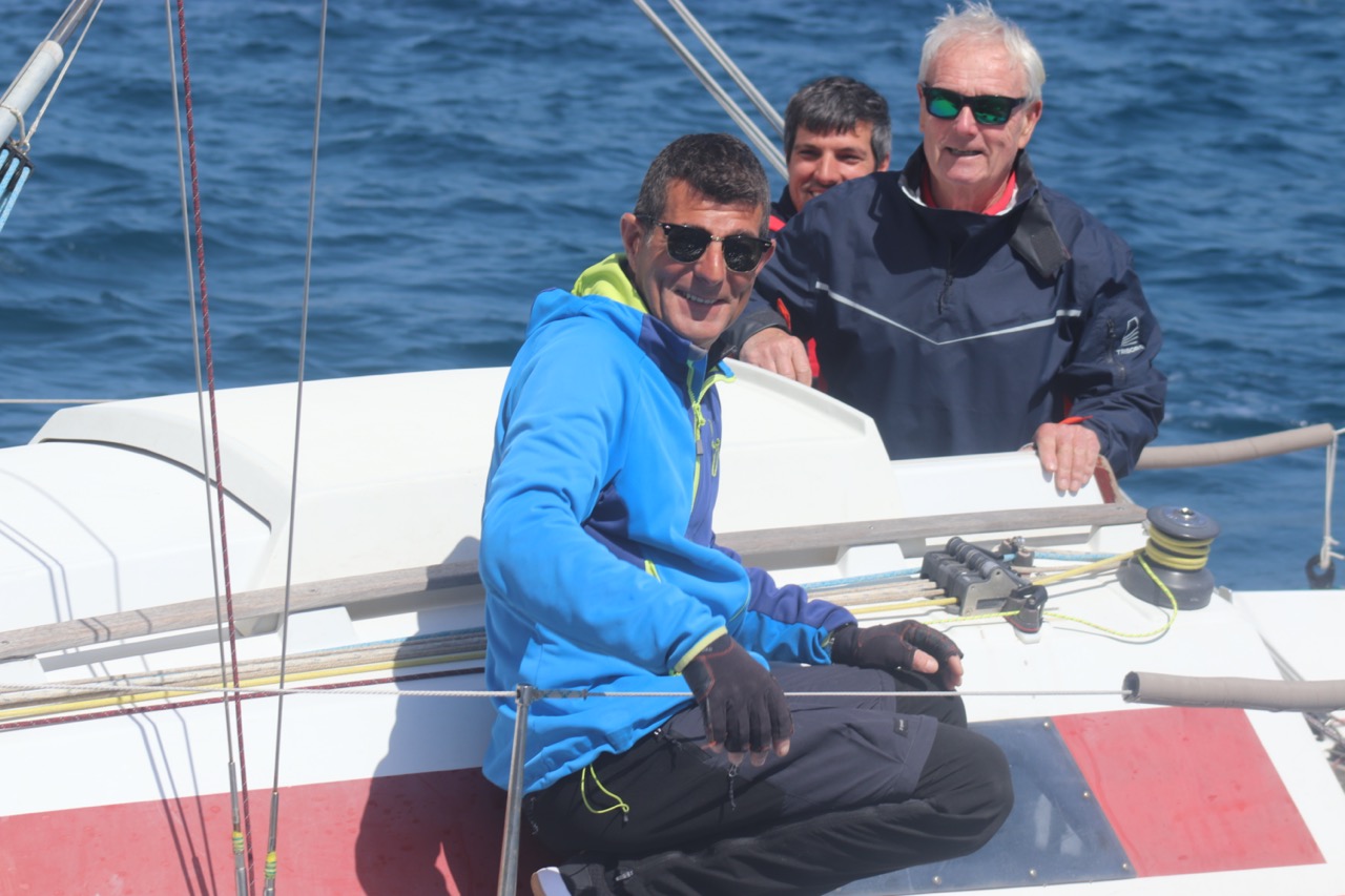 La régate s’est déroulée dans des conditions idéales : 12/17 noeuds de vent d’est. Après un rappel général, le départ de la régate a pu avoir lieu. Le parcours 2 était mouillé : bouée dans le sud-ouest de l’île Rousse, bouée de Sanary, bouée de l’île Rousse, bouée de Sanary et retour à Bandol.