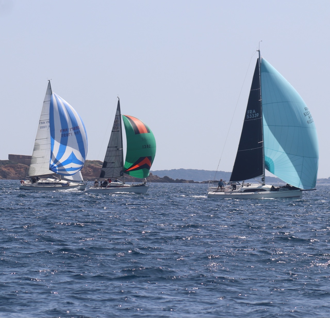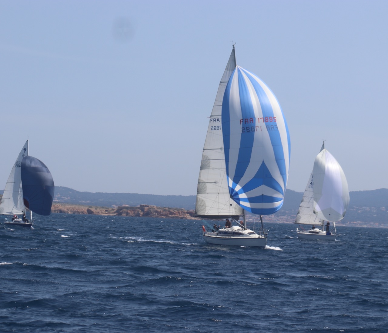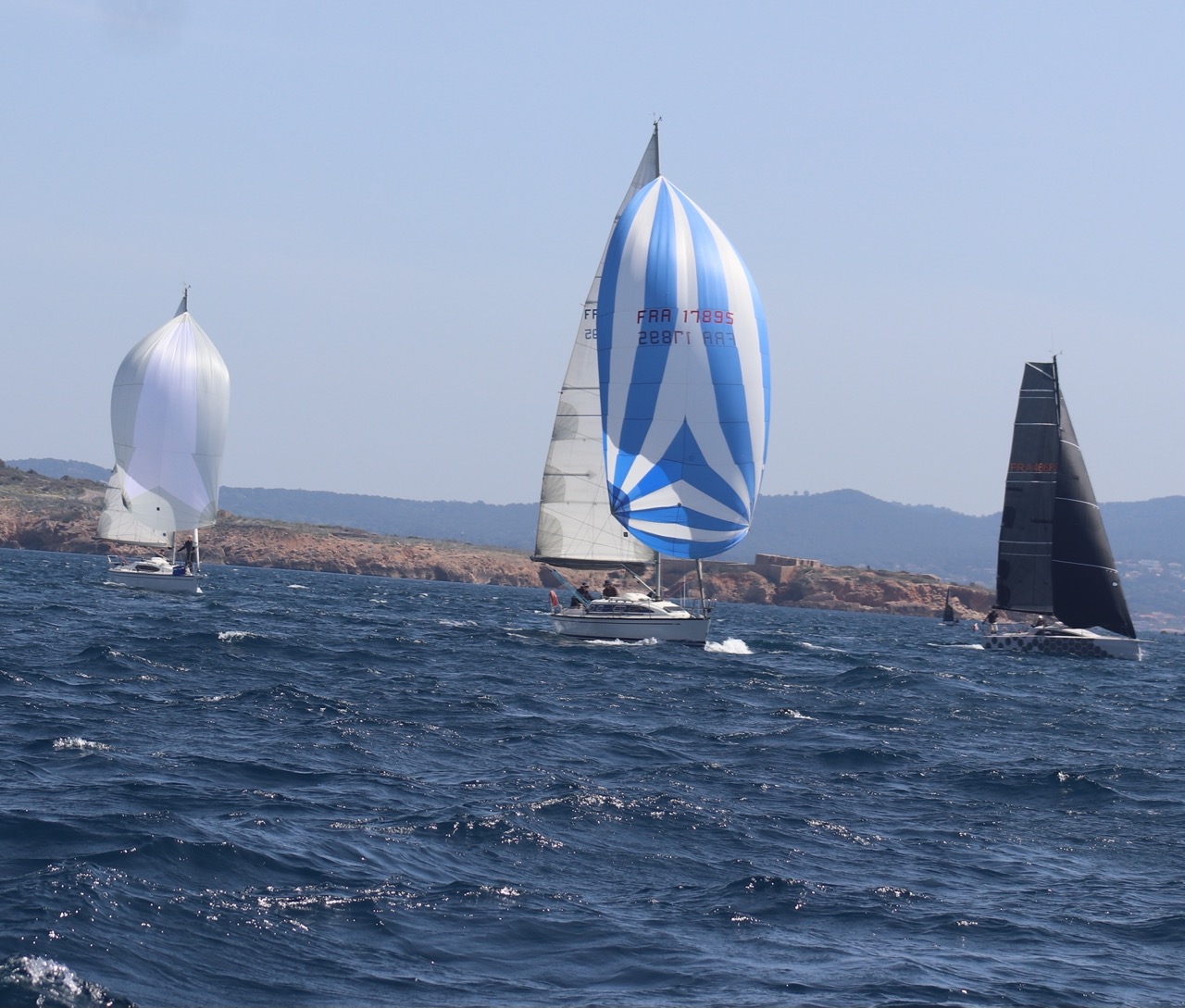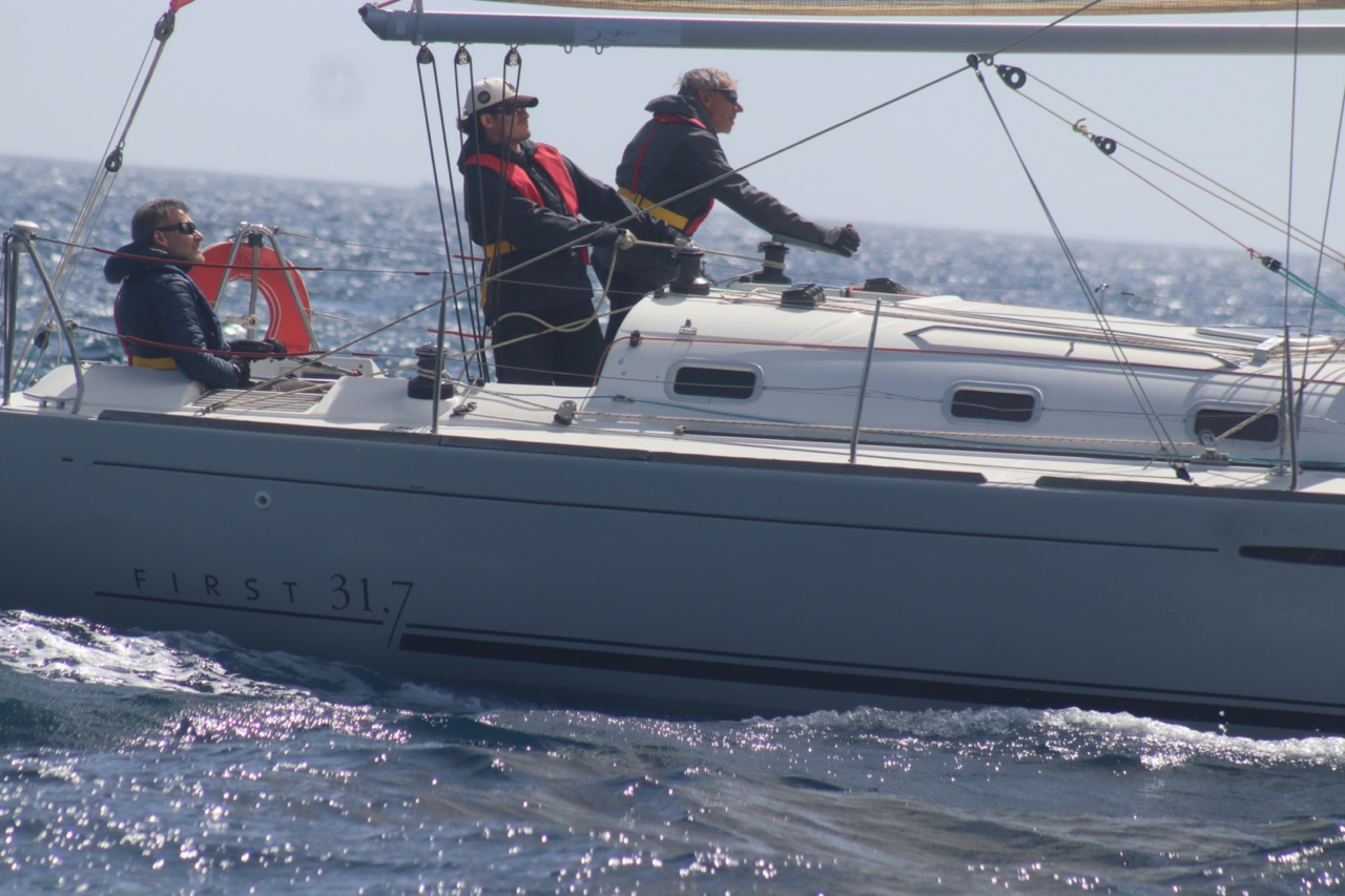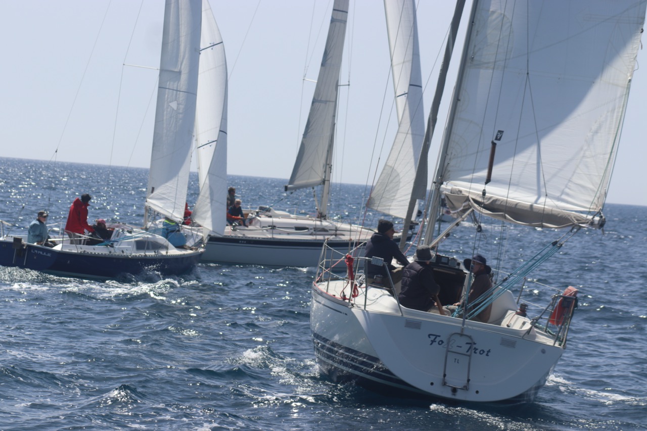 La régate s’est déroulée dans des conditions idéales : 12/17 noeuds de vent d’est. Après un rappel général, le départ de la régate a pu avoir lieu. Le parcours 2 était mouillé : bouée dans le sud-ouest de l’île Rousse, bouée de Sanary, bouée de l’île Rousse, bouée de Sanary et retour à Bandol.