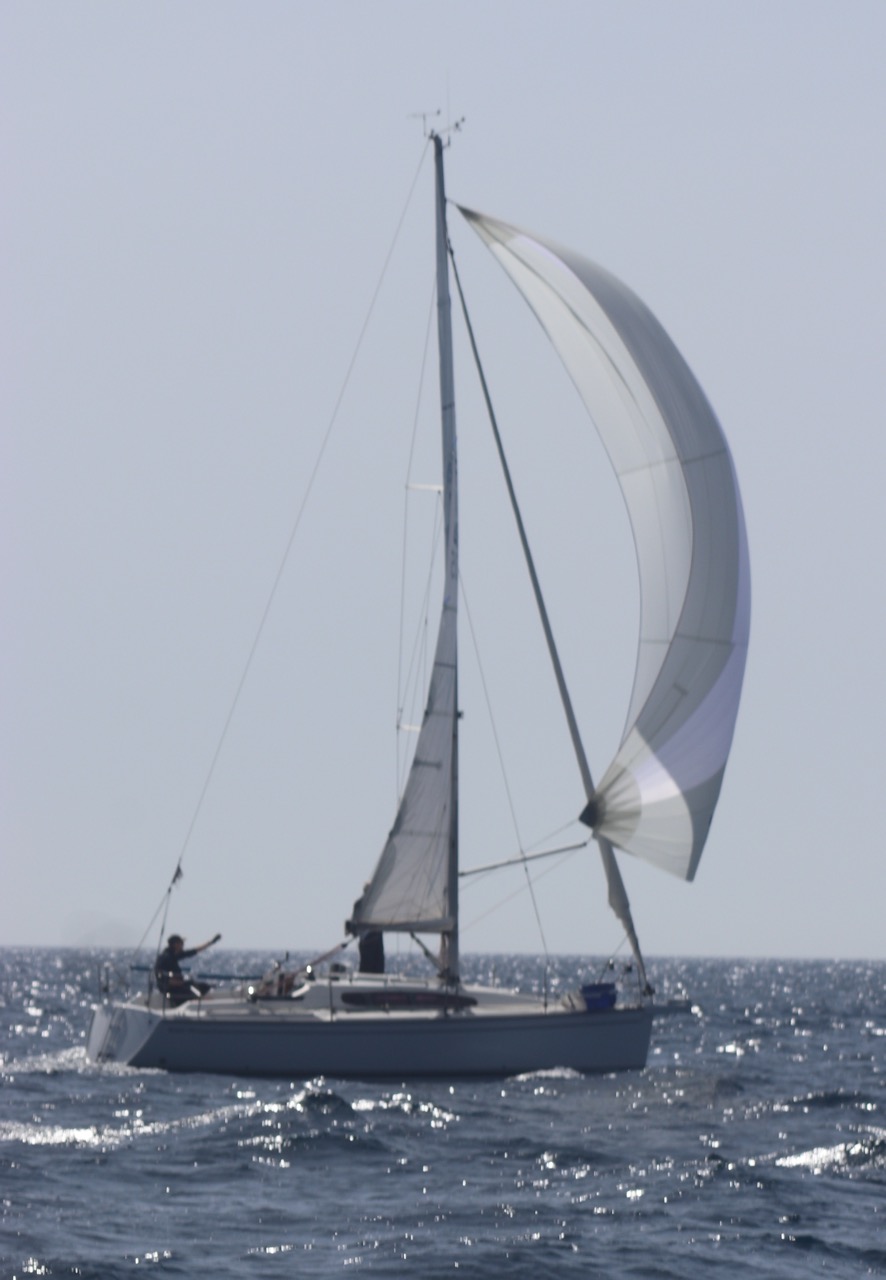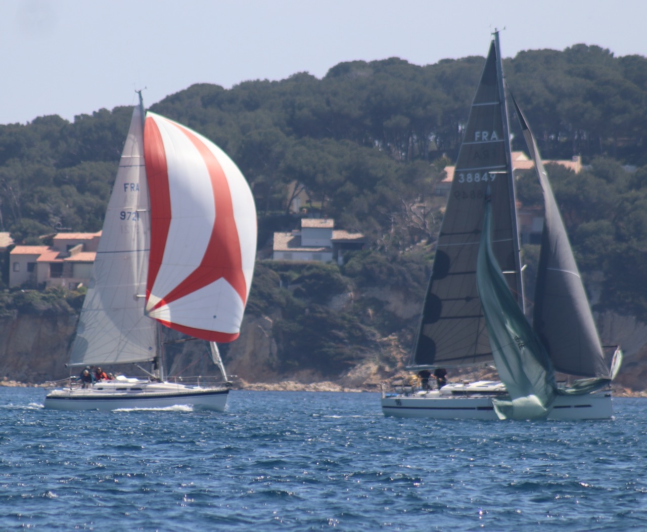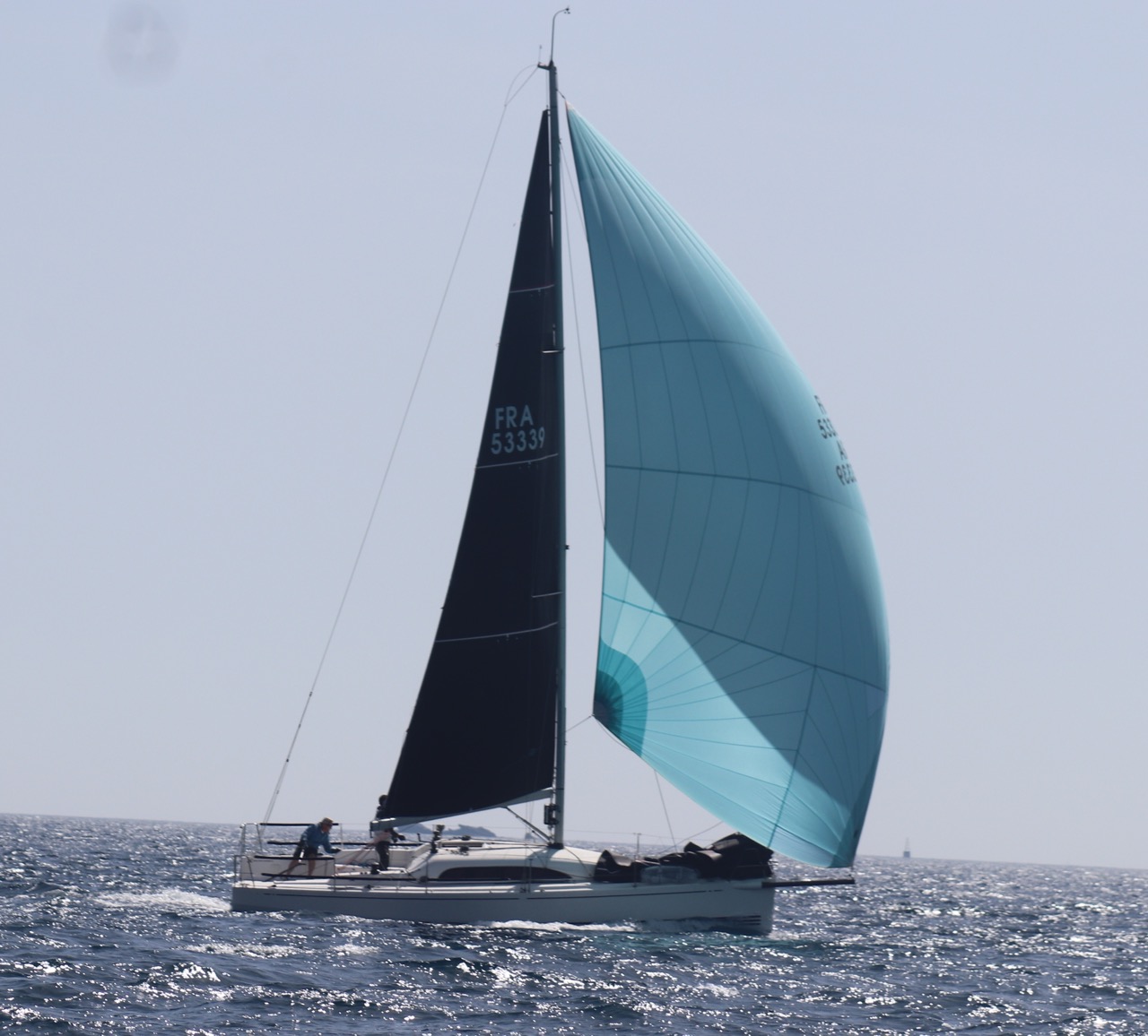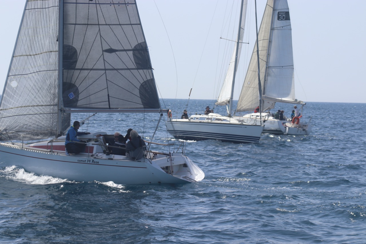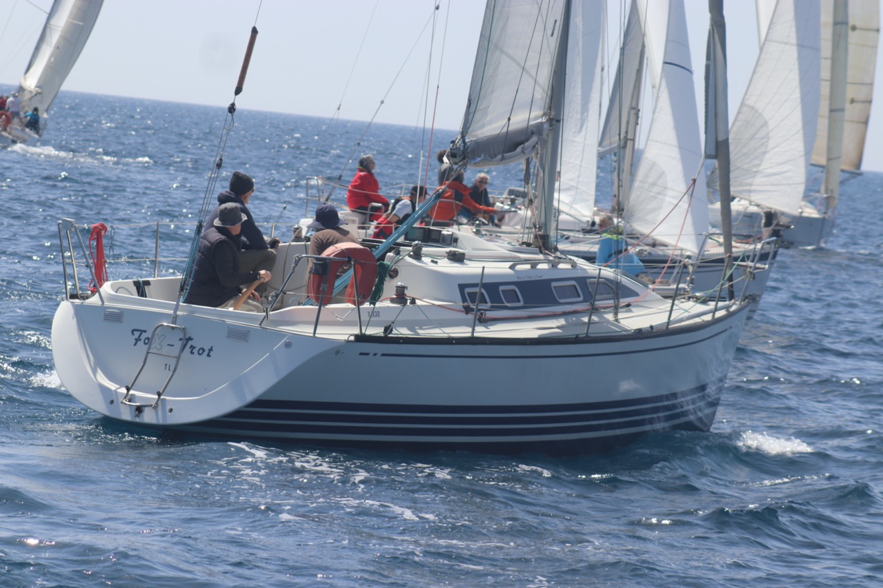 La régate s’est déroulée dans des conditions idéales : 12/17 noeuds de vent d’est. Après un rappel général, le départ de la régate a pu avoir lieu. Le parcours 2 était mouillé : bouée dans le sud-ouest de l’île Rousse, bouée de Sanary, bouée de l’île Rousse, bouée de Sanary et retour à Bandol.